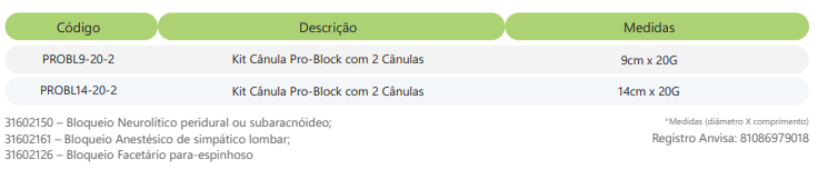 O Kit Cânula Pro-Block com o Grid Radiopaco é indicado para o Bloqueio analgésico seletivo de nervos nos tratamentos da dor crônica da coluna vertebral.